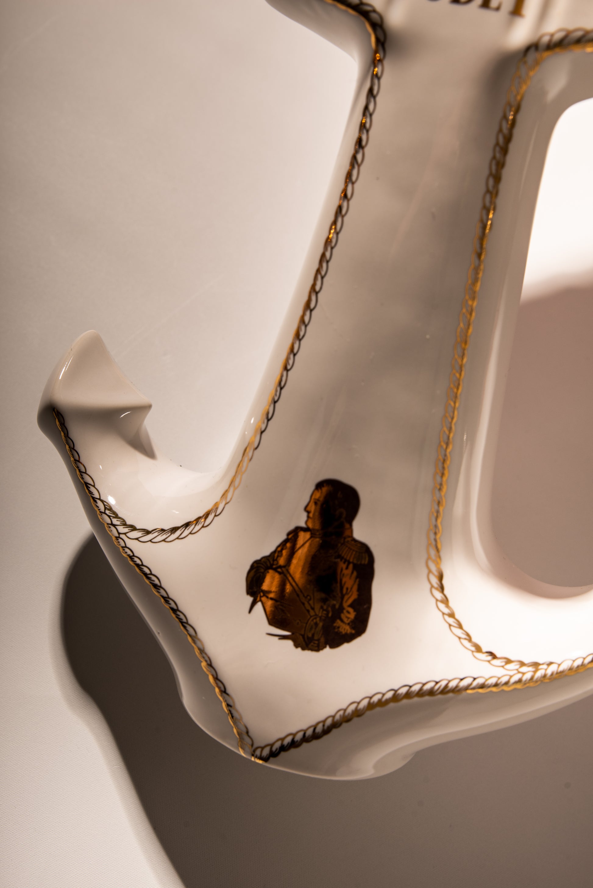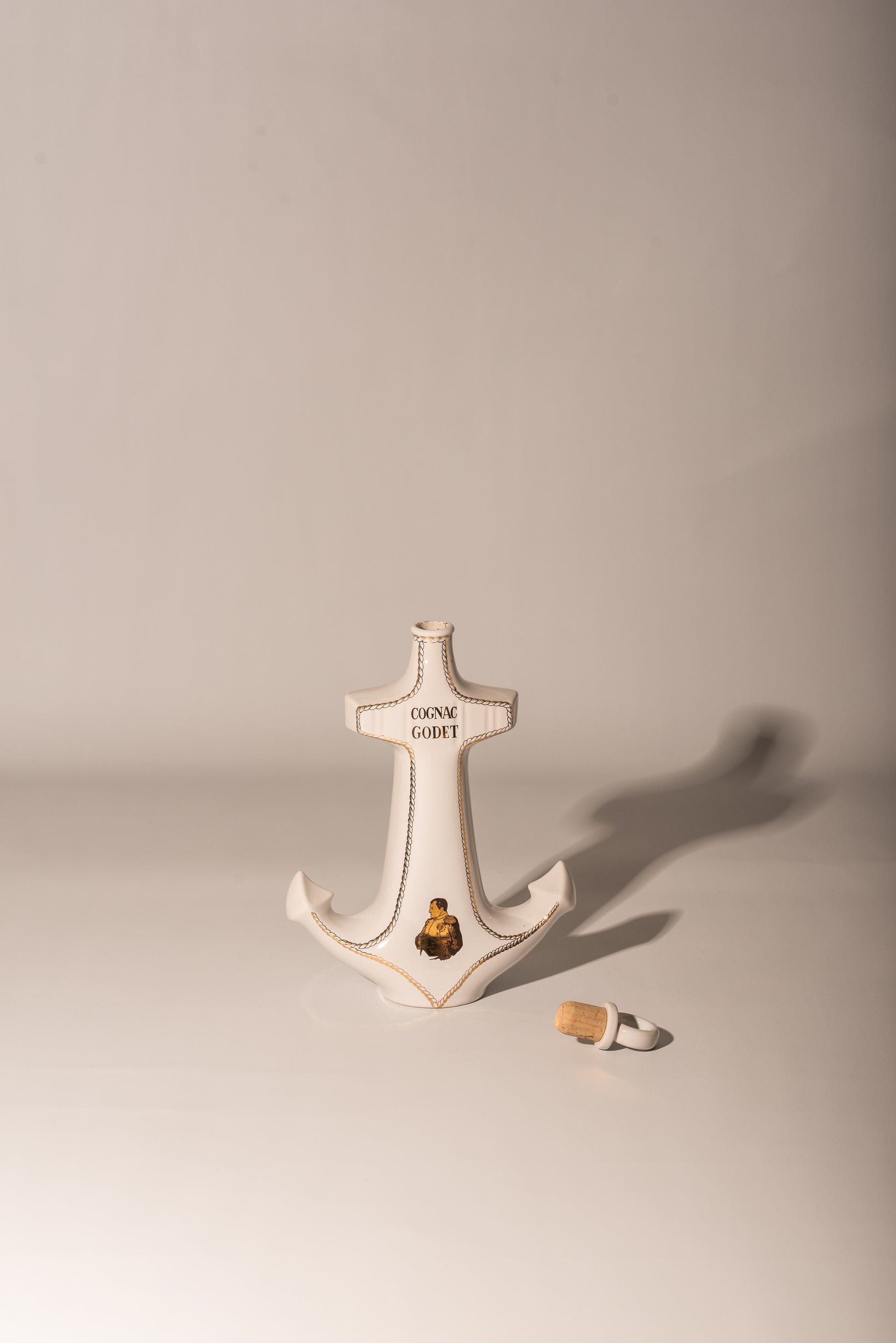 Ceramic, anchor shaped bottle (empty) in shiny gold finish.