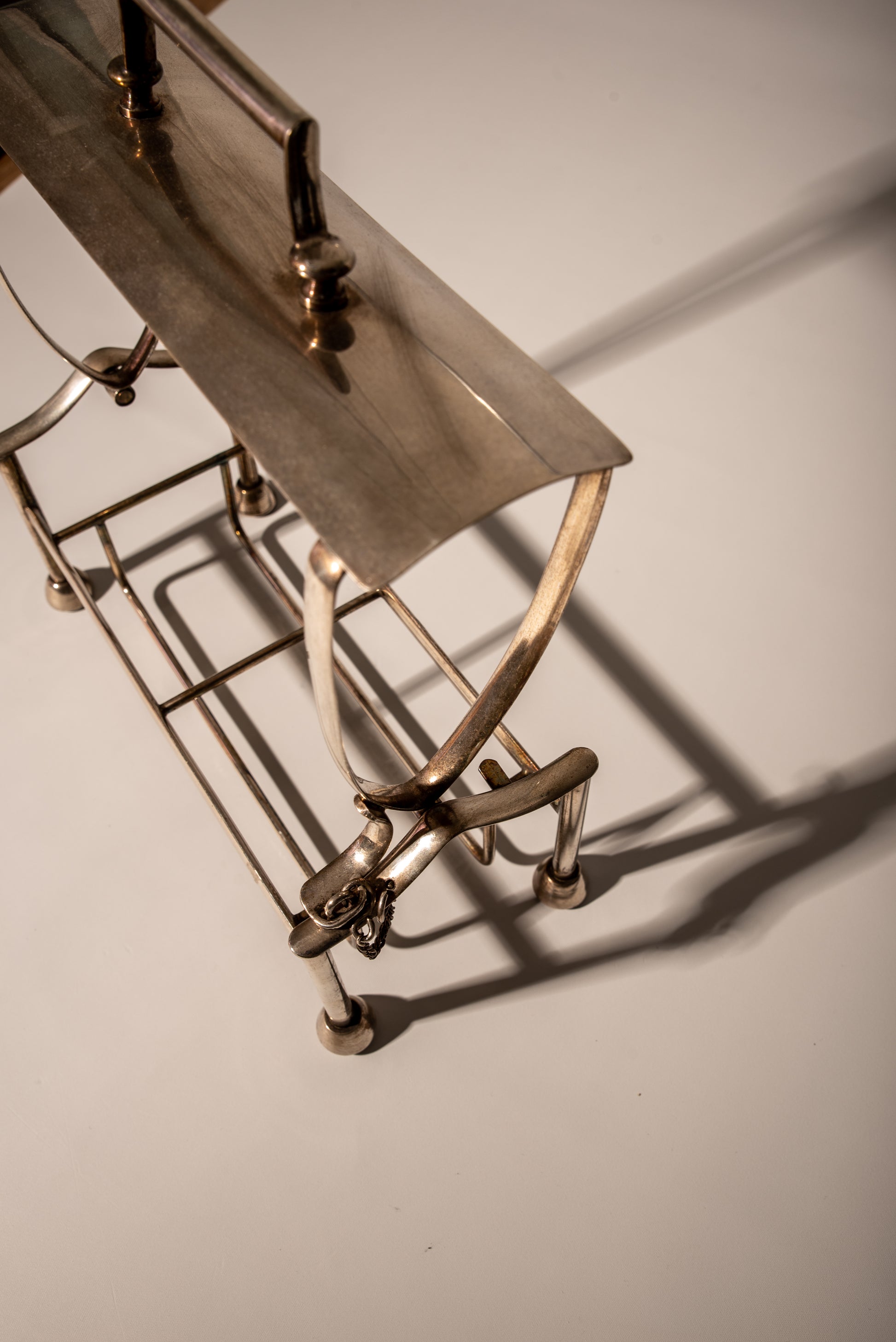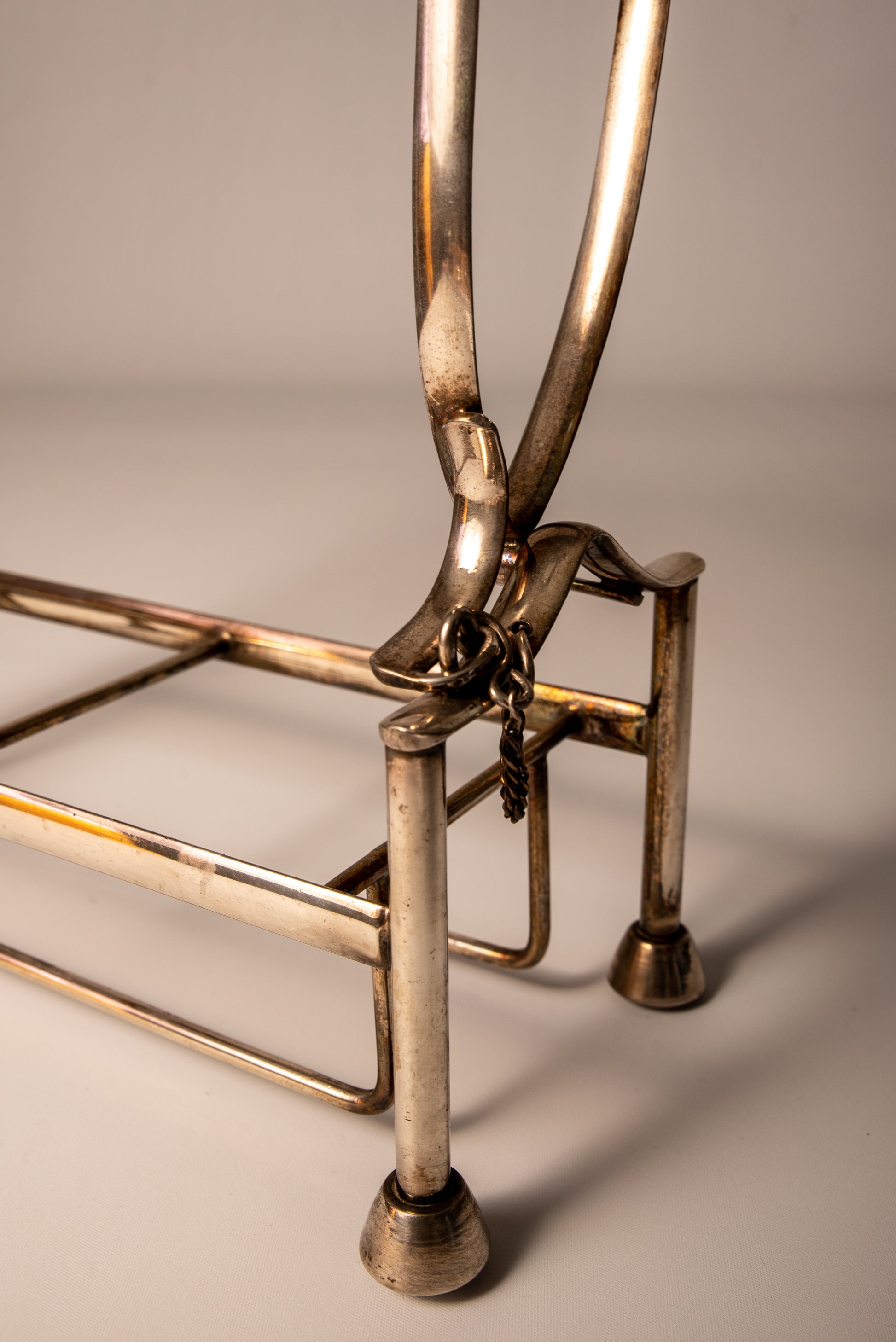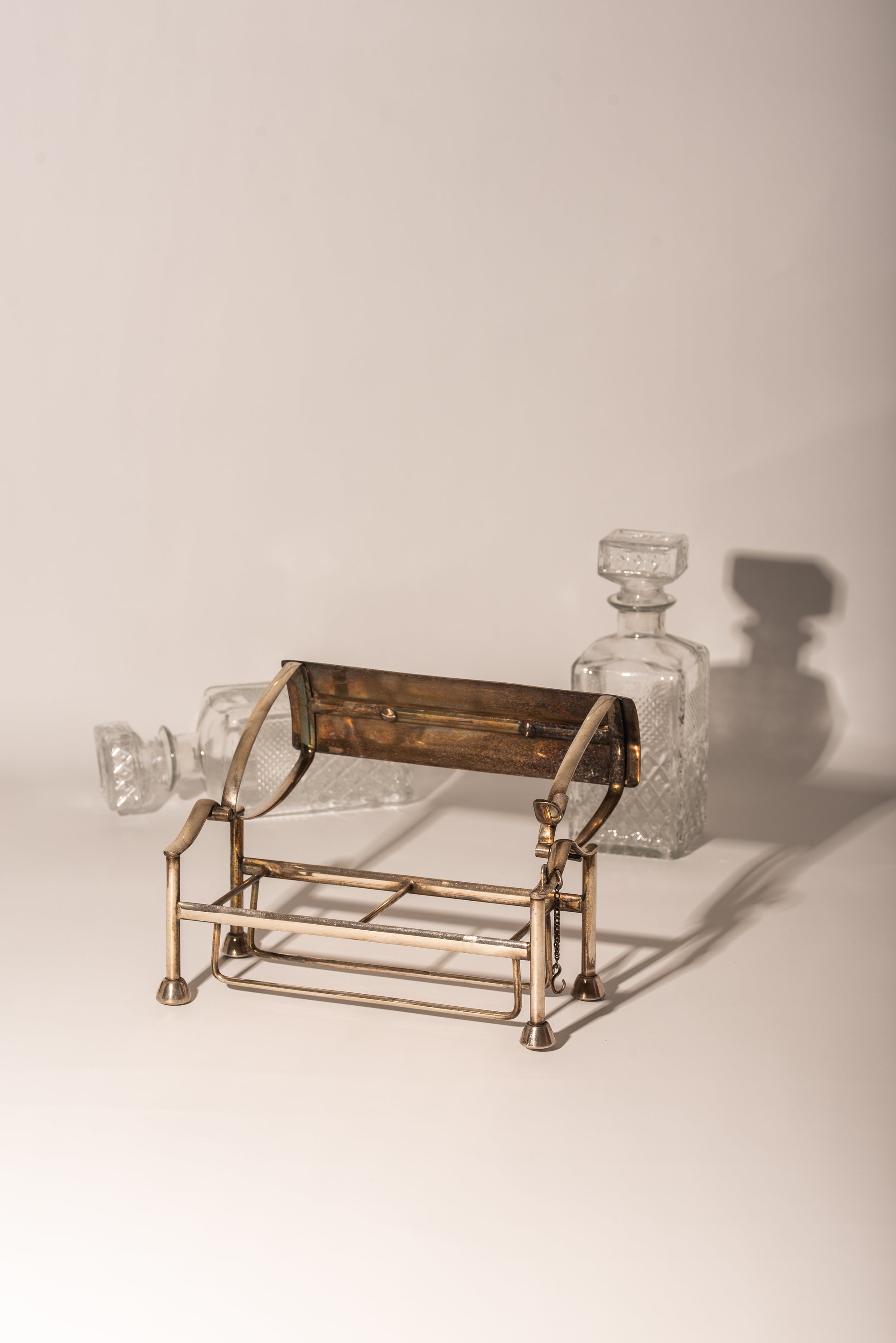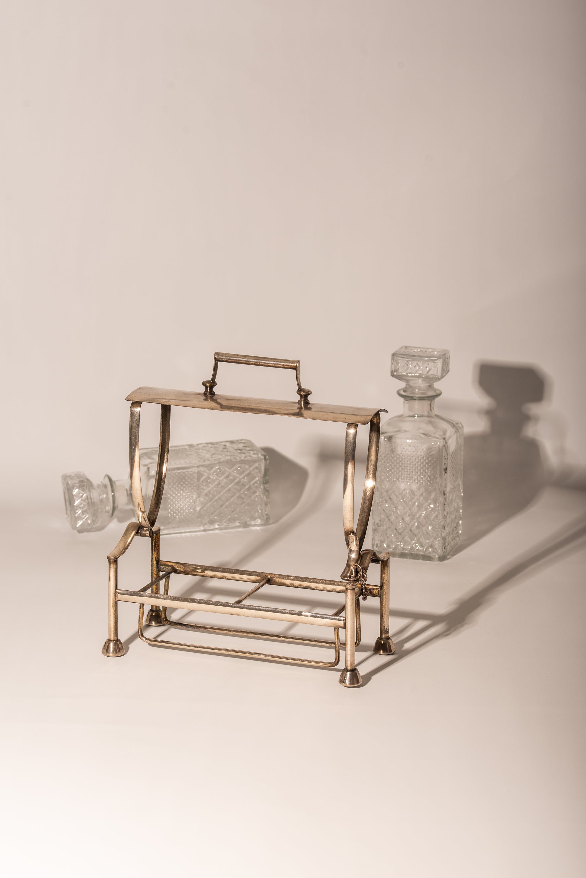 Silver Plate caddy holder with opening mechanism, a handle, and a latch.