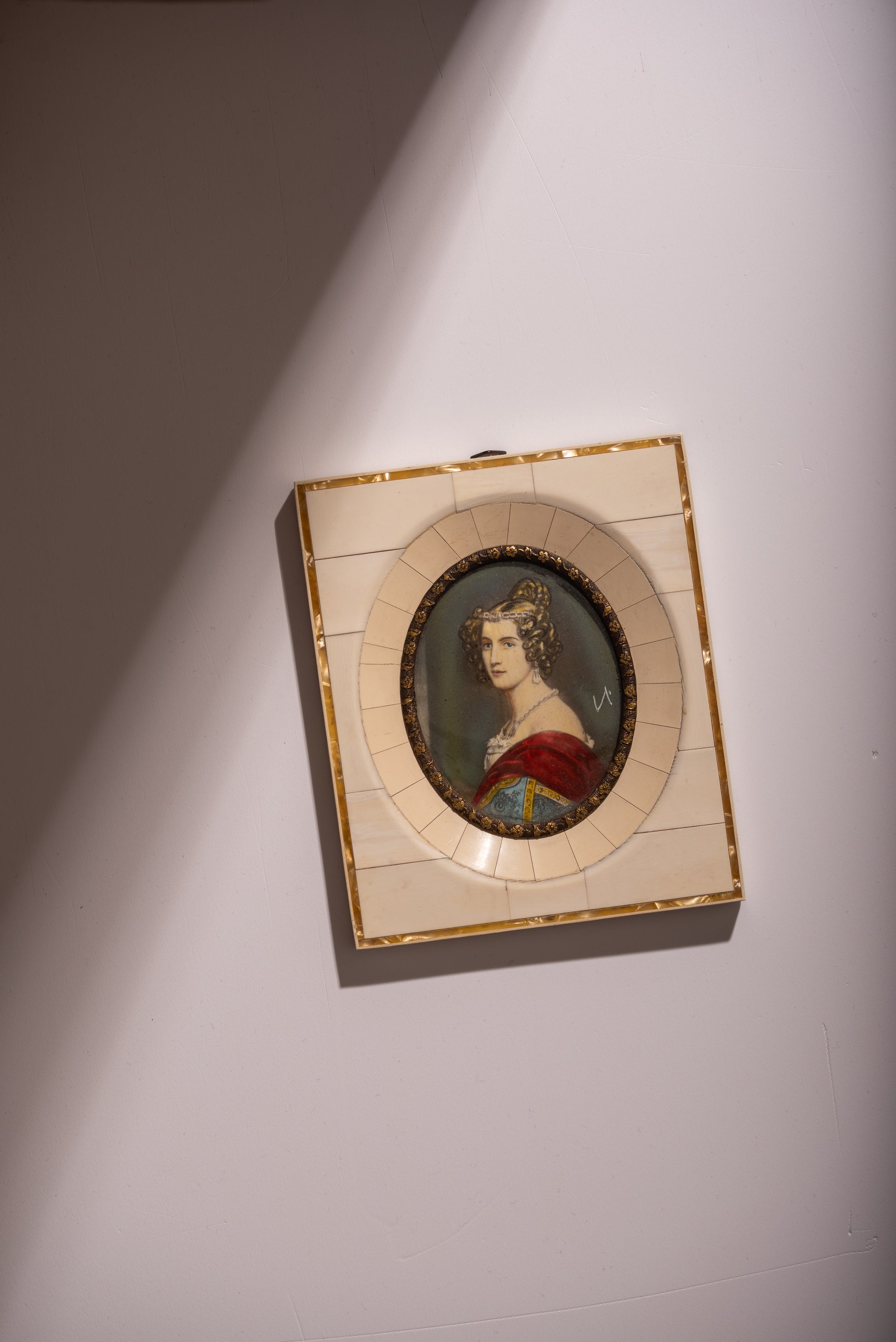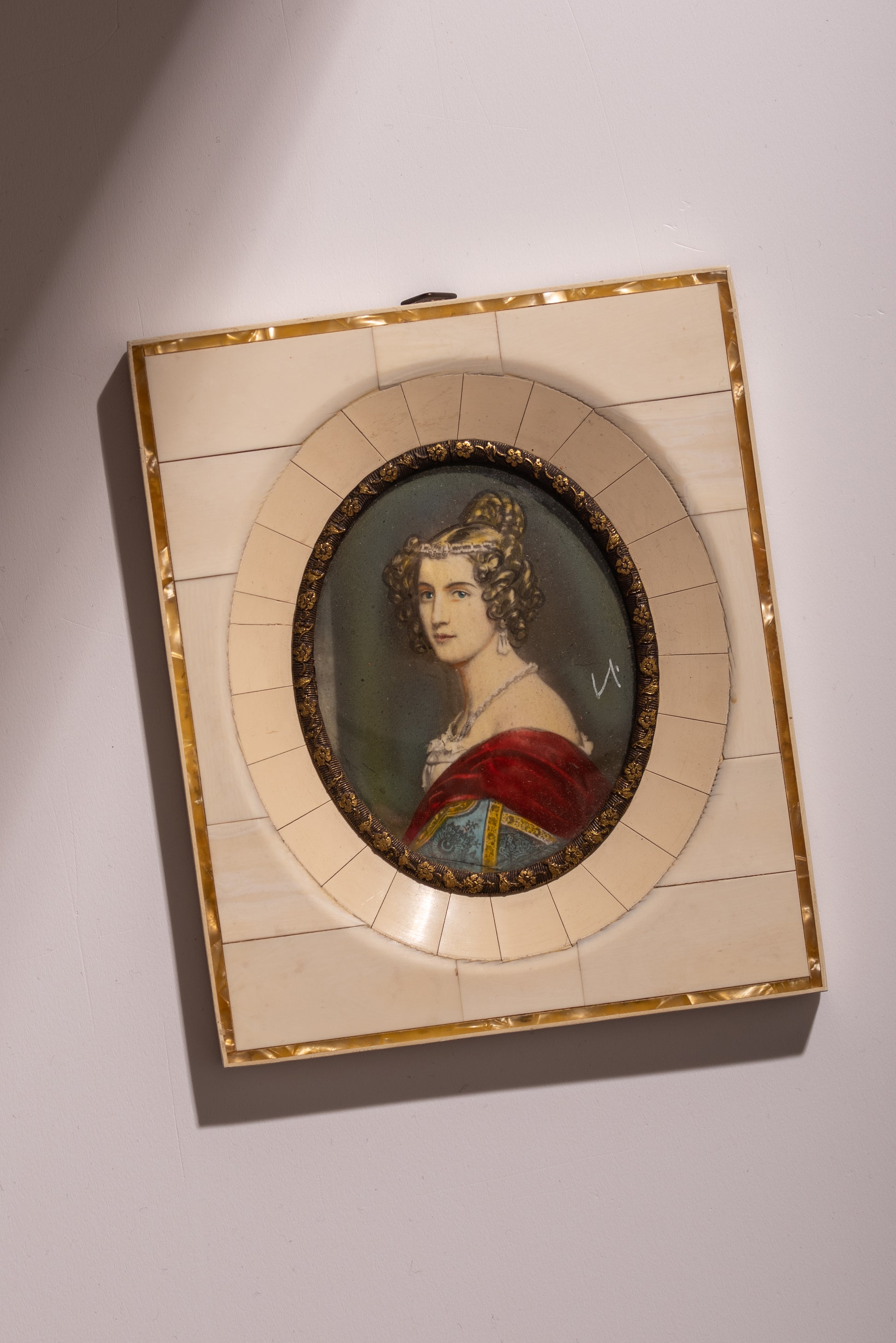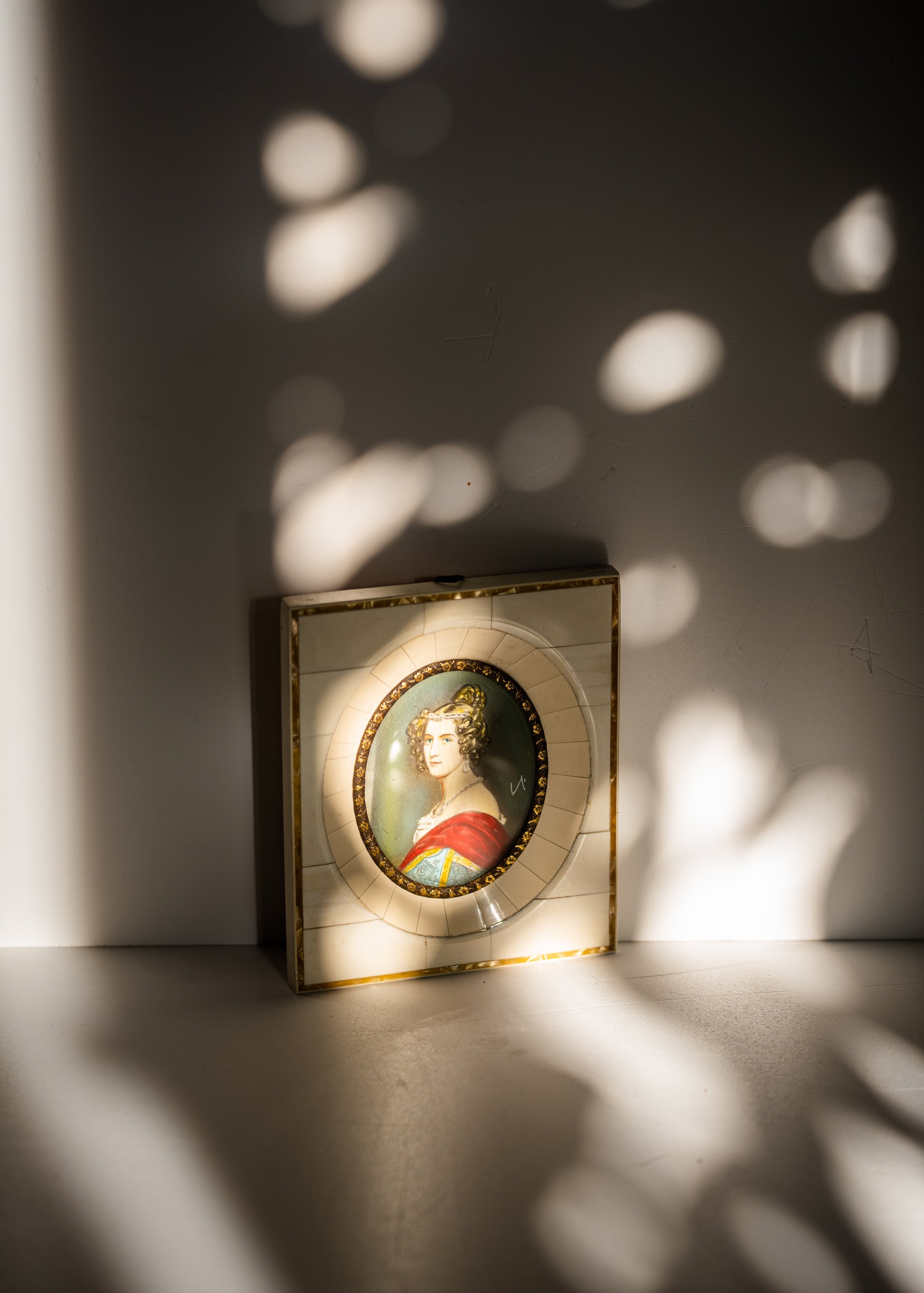 Patterned ivory, brass and convex glass.