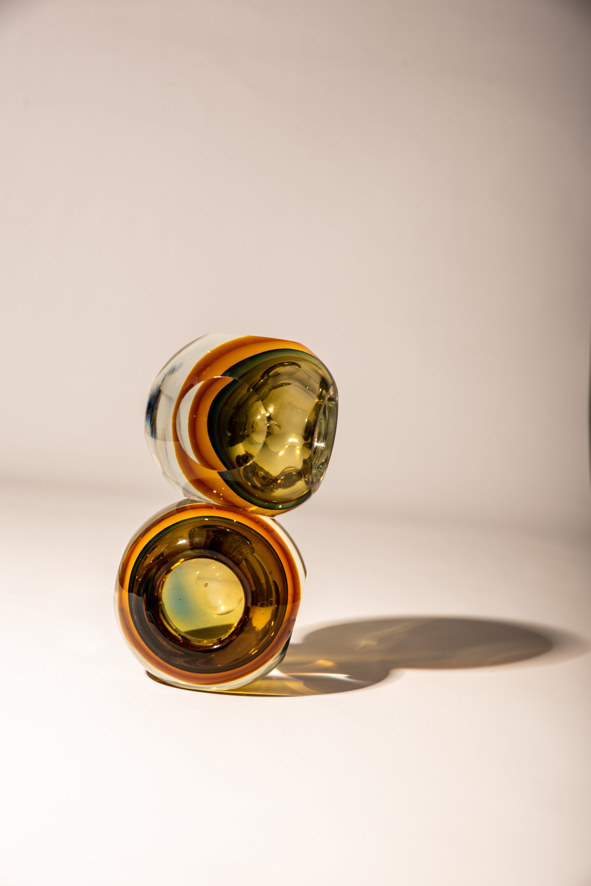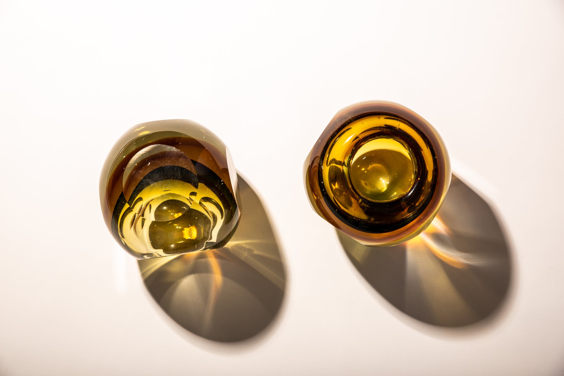 Sommerso Murano glass candle holders, faceted on five sides in yellow, orange, amber and brown.